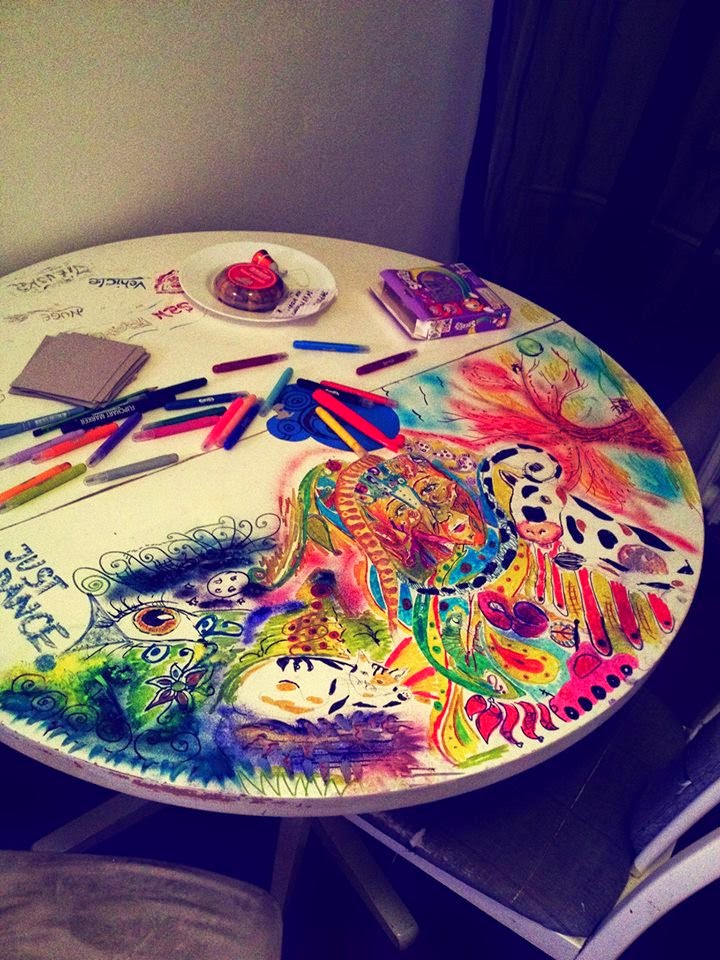 To jsem se bohužel neudržela a pokreslila stůl. DÍKY BOHU, že mám tak tolerantní spolubydlící a pana domácího, že to nikomu nevadilo.